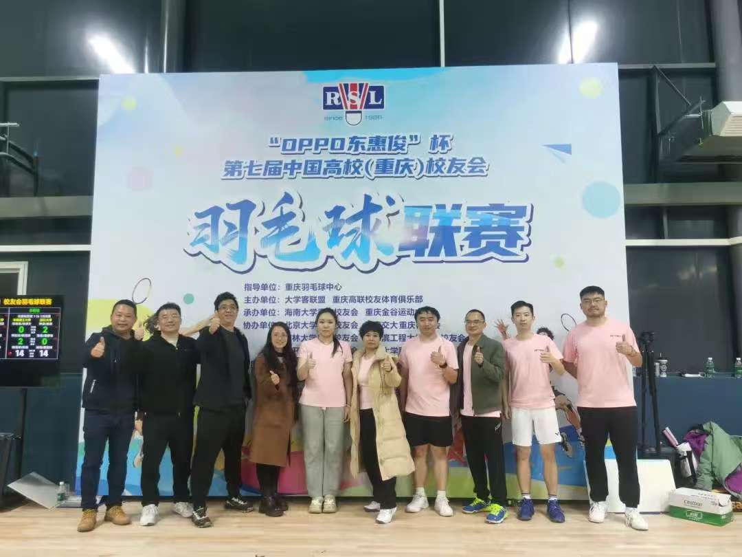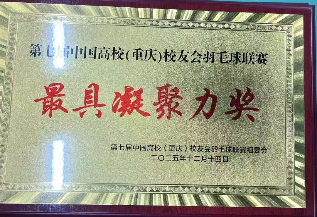 12月13日-14日在重庆两江新区金谷运动中心举行的第七届中国高校(重庆)校友会羽毛球联赛中,重庆校友羽毛球队获得组委会颁发的“最具凝聚力奖”,表彰参赛队友们团结拼搏、无惧挑战、坚决打好每一场比赛并最终从48支队伍中闯进16强,这场比赛再次获得了众多友校球队关注和称赞。