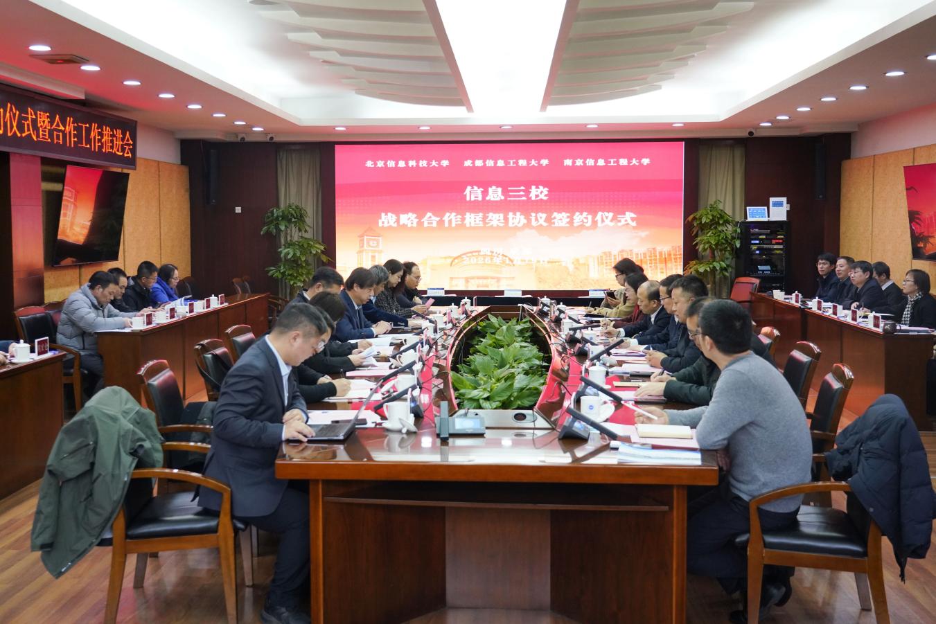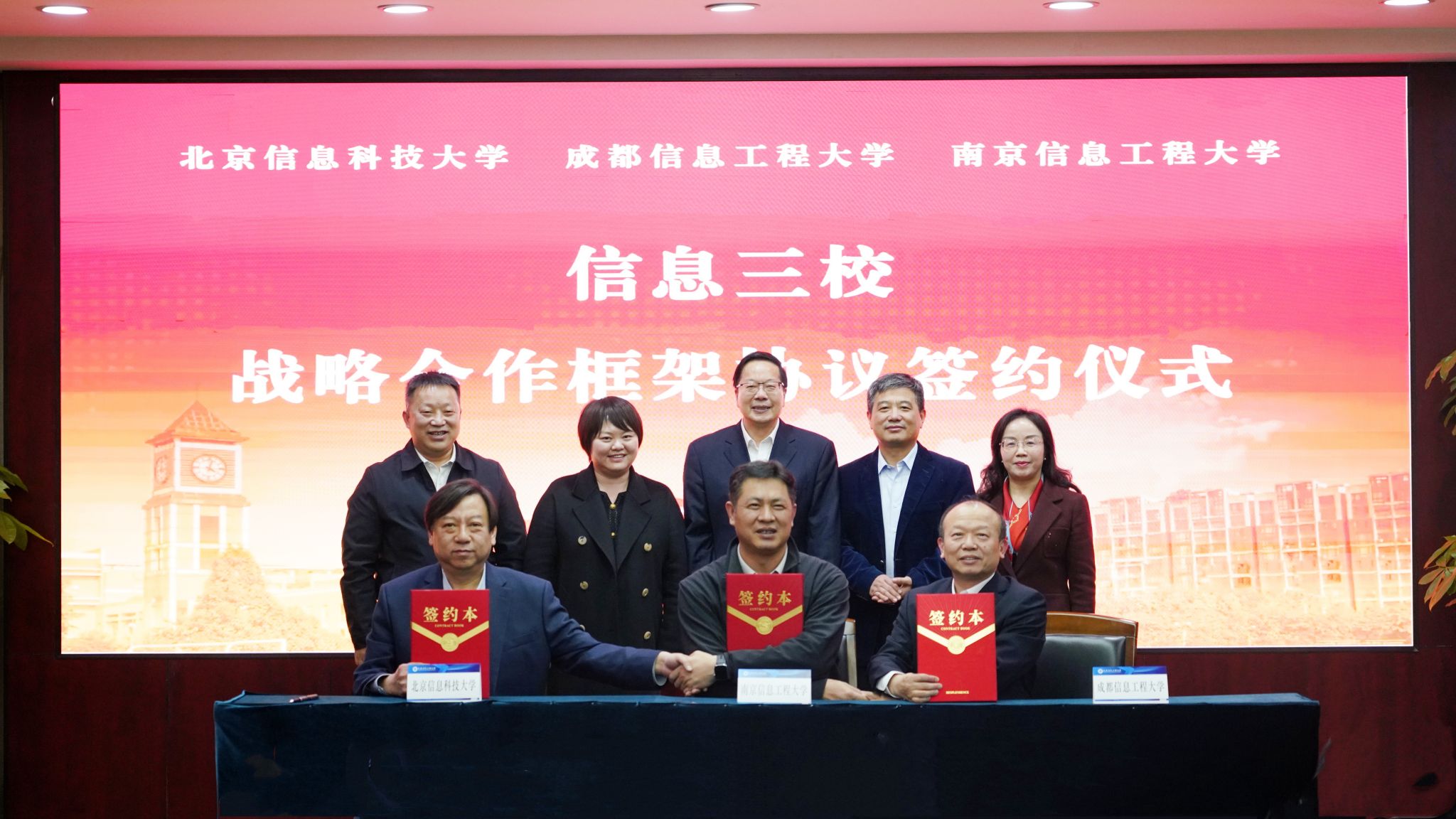 北京信息科技大学党校办、教务处、发展战略与规划处、产教融合办公室、对外合作联络办、校友办、信息与通信工程学院,南京信息工程大学党委办公室、校长办公室、发展规划处、教务处主要负责人,我校相关职能部门与学院主要负责人参加签约仪式。