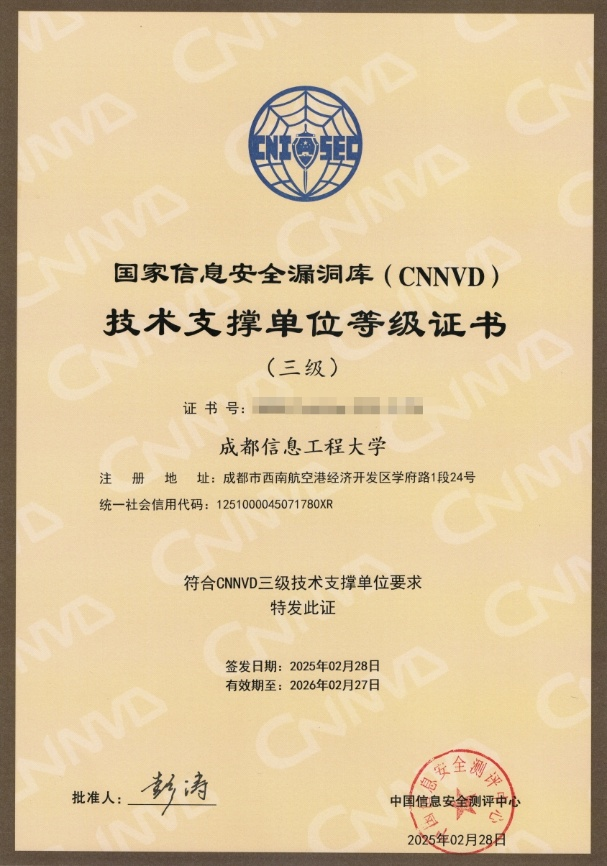 近日,在学校网络空间安全学院师生的共同努力下,我校凭借在信息安全领域的技术积累,通过中国信息安全测评中心审核,正式入选国家信息安全漏洞库(CNNVD)技术支撑单位(三级)。这一成就标志着betway必威西汉姆联在漏洞挖掘、风险研判、安全防护等领域的技术实力获国家级认可,成为服务“网络强国”战略的“高校先锋”。