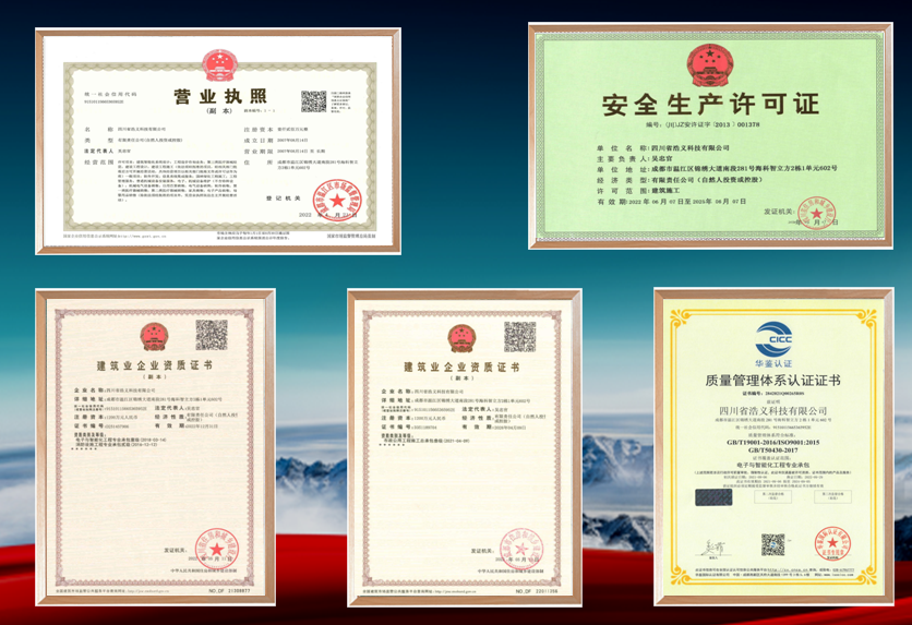 公司经多年发展,已培养出一支战训有素的专业技术团队,公司现具有“电子与智能化工程专业承包壹级资质”、“市政公用工程施工总承包叁级资质”、“消防设施工程专业承包貮级资质”、“有线广播电视工程企业总承包贰级资质”。公司从产品采购、销售、施工到售后服务均严格按照ISO9001及ISO50430质量管理体系标准制定、执行、实施;依靠其可靠质量、先进技术、良好口碑,先后被授予“质量、服务、诚信3A企业”、“重合同,守信用企业”;“四川质量信誉服务5A企业”;“四川省优秀企业示范单位”称号。