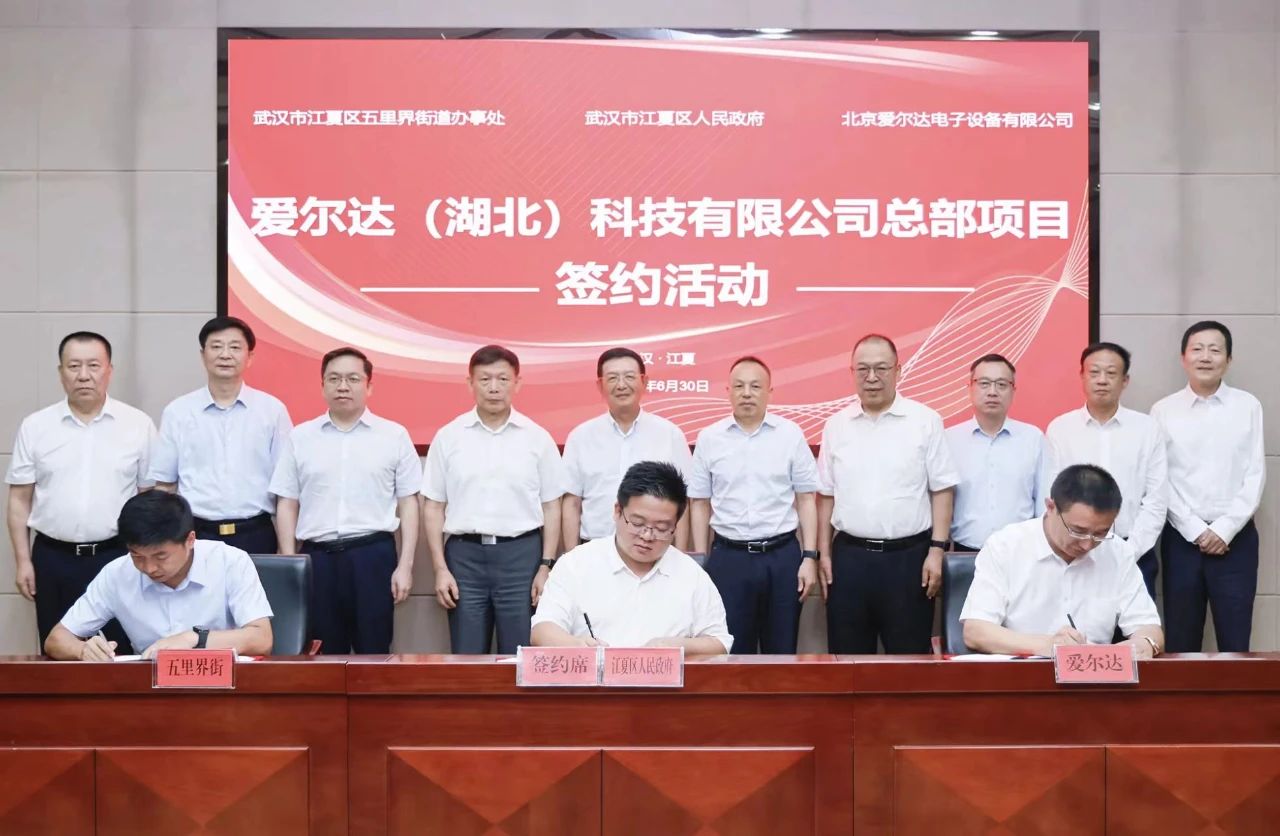 6月30日,校友企业北京爱尔达电子设备有限公司与江夏区人民政府成功签署合作协议,湖北总部项目正式落户江夏区。中国气象服务协会会长许小峰,全国工商联科技装备业商会秘书长乔晓林,中国雷达行业协会副理事长兼秘书长陈升友,美利信控股有限公司董事长余克飞,美利信控股有限公司副董事长、北京爱尔达电子设备有限公司总经理余人麟,湖北省人民政府驻山西办事处主任游伟,武汉市人民政府驻北京办事处党组成员副主任汪峰,江夏区区委副书记、区长舒贵传,区领导刘勇、聂开天及武汉大学、华中科技大学、湖北大学、武汉轻工业大学、杭州电子科技大学等高校嘉宾出席。我校校友办主任、教育基金会理事长张斌兵应邀出席。