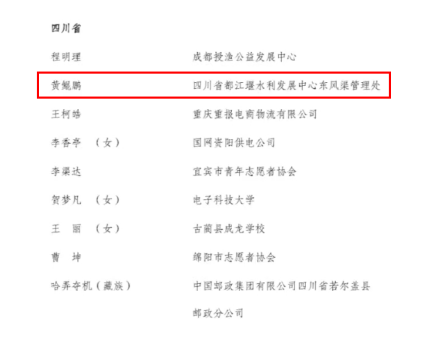 12月5日上午,共青团中央发布了关于表彰第十四届中国青年志愿者优秀个人奖、组织奖、项目奖的决定,来自四川省都江堰水利发展中心的职工黄鲲鹏榜上有名,荣获“中国青年志愿者优秀个人”,成为全国水利系统内本届唯一获此殊荣的职工,也成为四川省荣登该榜单的9个人之一。