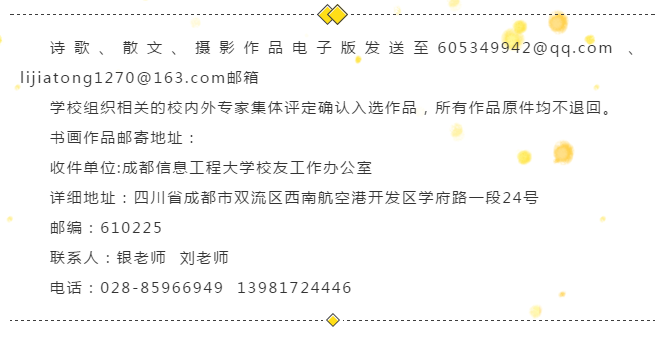 诗歌、散文作品电子邮件标题格式均为:成信大70周年校庆+作品名称+作者姓名+联系方式,每人提交作品数量原则上不超过2篇,国家级以上获奖作品数量不限。
